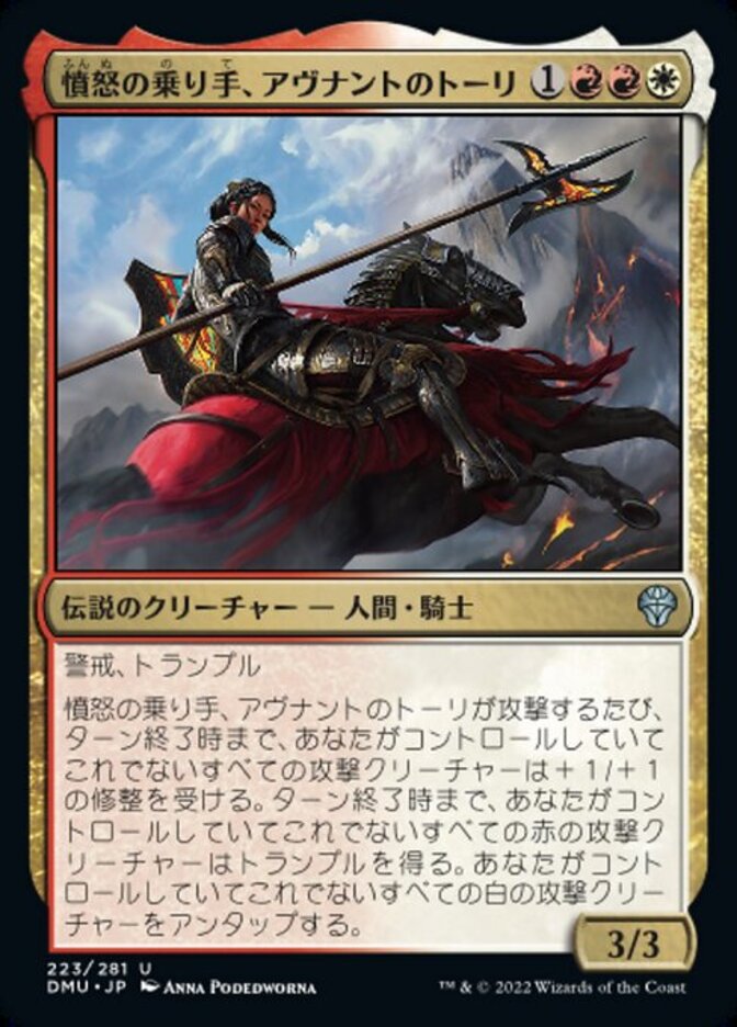 | Rules | Vigilance, trample Whenever Tori D'Avenant, Fury Rider attacks, all other attacking creatures you control get +1/+1 until end of turn. Other red attacking creatures you control gain trample until end of turn Untap each other white attacking creature you control. |