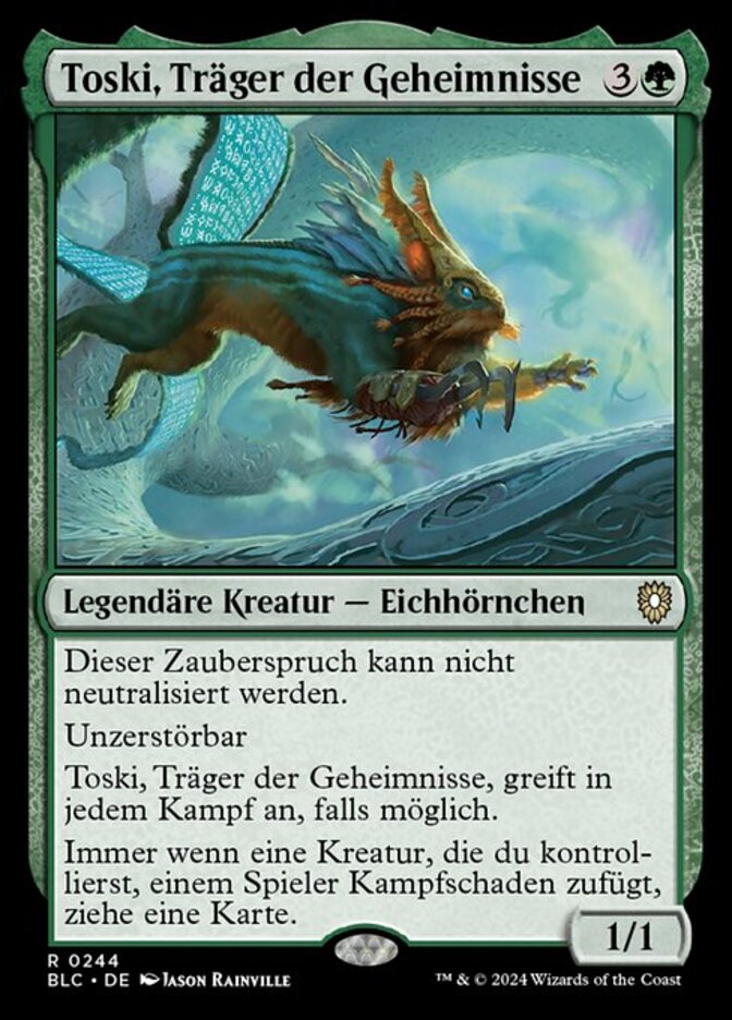 | Rules | This spell can't be countered. Indestructible Toski, Bearer of Secrets attacks each combat if able. Whenever a creature you control deals combat damage to a player, draw a card. |