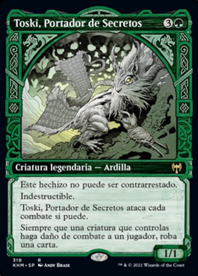 | Rules | This spell can't be countered. Indestructible Toski, Bearer of Secrets attacks each combat if able. Whenever a creature you control deals combat damage to a player, draw a card. |