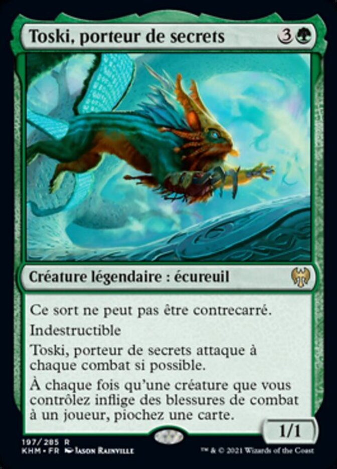 | Rules | This spell can't be countered. Indestructible Toski, Bearer of Secrets attacks each combat if able. Whenever a creature you control deals combat damage to a player, draw a card. |