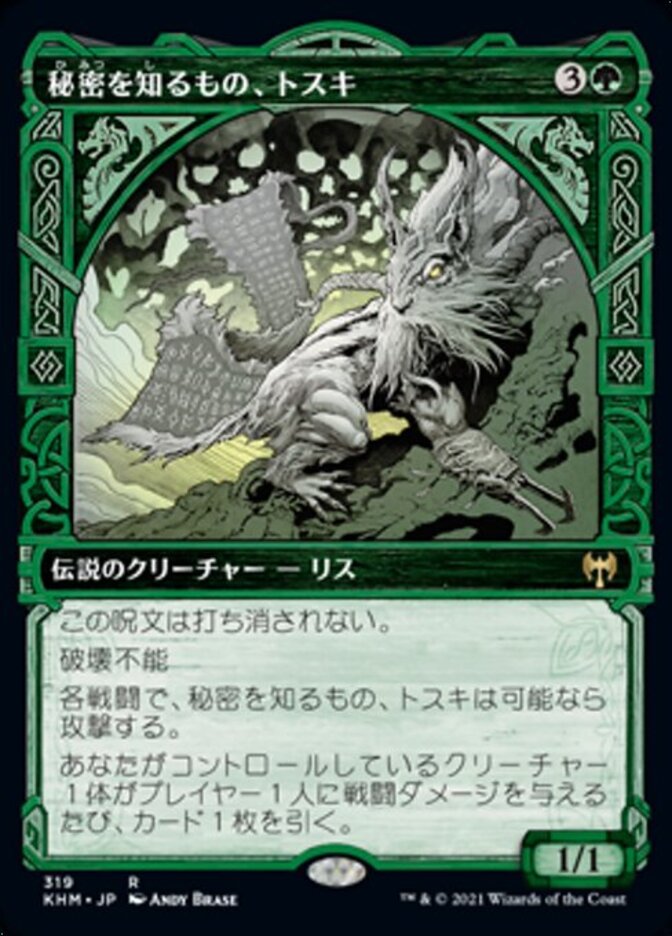 | Rules | This spell can't be countered. Indestructible Toski, Bearer of Secrets attacks each combat if able. Whenever a creature you control deals combat damage to a player, draw a card. |
