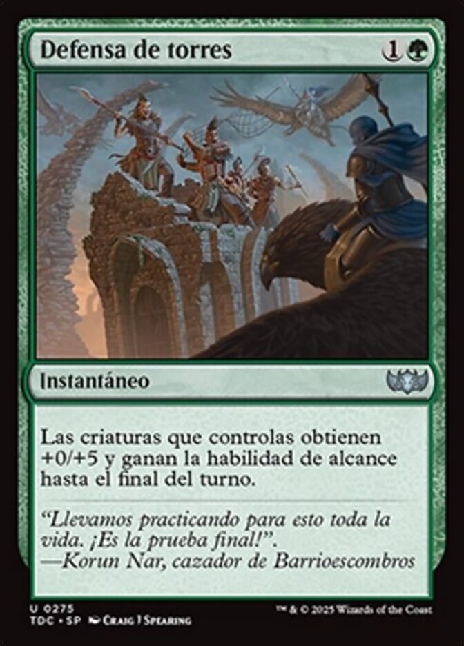 | Rules | Creatures you control get +0/+5 and gain reach until end of turn. |