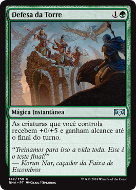 | Rules | Creatures you control get +0/+5 and gain reach until end of turn. |