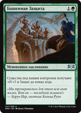 | Rules | Creatures you control get +0/+5 and gain reach until end of turn. |