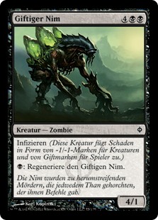 | Rules | Infect (This creature deals damage to creatures in the form of -1/-1 counters and to players in the form of poison counters.) : Regenerate Toxic Nim. |