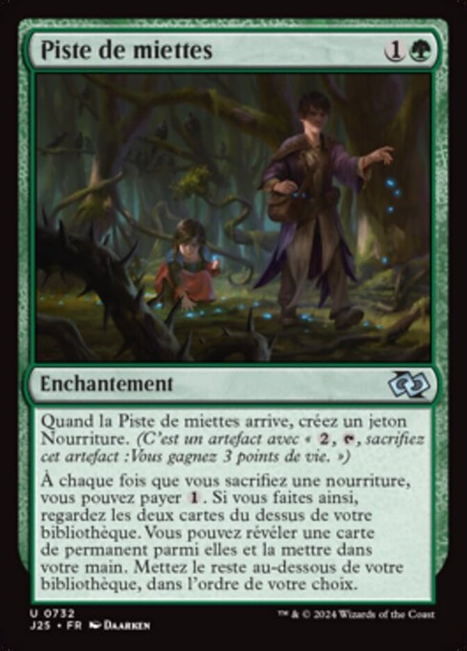 | Rules | When Trail of Crumbs enters the battlefield, create a Food token. (It's an artifact with ", , Sacrifice this artifact: You gain 3 life.") Whenever you sacrifice a Food, you may pay . If you do, look at the top two cards of your library. You may reveal a permanent card from among them and put it into your hand. Put the rest on the bottom of your library in any order. |