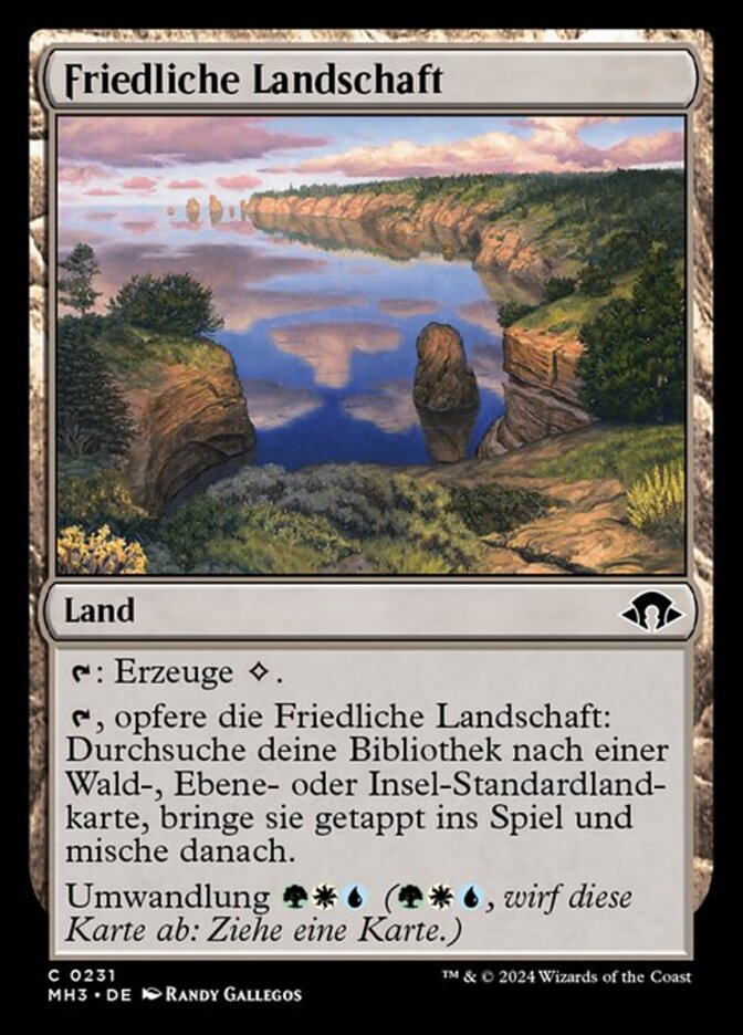 | Rules | : Add . , Sacrifice Tranquil Landscape: Search your library for a basic Forest, Plains, or Island card, put it onto the battlefield tapped, then shuffle. Cycling (, Discard this card: Draw a card.) |