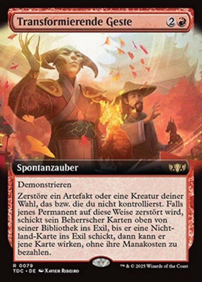 | Rules | Demonstrate (When you cast this spell, you may copy it. If you do, choose an opponent to also copy it. Players may choose new targets for their copies.) Destroy target artifact or creature you don't control. If that permanent is destroyed this way, its controller exiles cards from the top of their library until they exile a nonland card, then they may cast that card without paying its mana cost. |