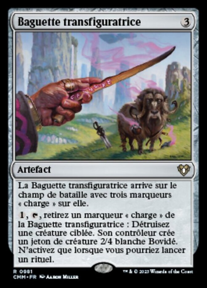| Rules | Transmogrifying Wand enters the battlefield with three charge counters on it. , , Remove a charge counter from Transmogrifying Wand: Destroy target creature. Its controller creates a 2/4 white Ox creature token. Activate only as a sorcery. |
