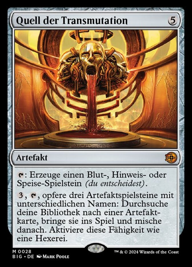 | Rules | : Create your choice of a Blood token, a Clue token, or a Food token. , , Sacrifice three artifact tokens with different names: Search your library for an artifact card, put it onto the battlefield, then shuffle. Activate only as a sorcery. |