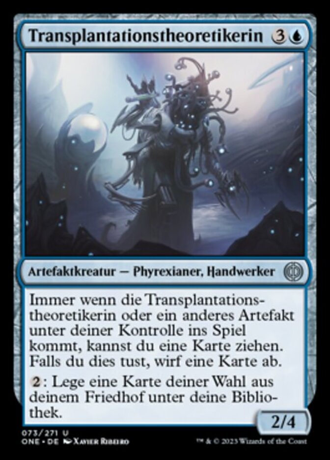 | Rules | Whenever Transplant Theorist or another artifact enters the battlefield under your control, you may draw a card. If you do, discard a card. : Put target card from your graveyard on the bottom of your library. |