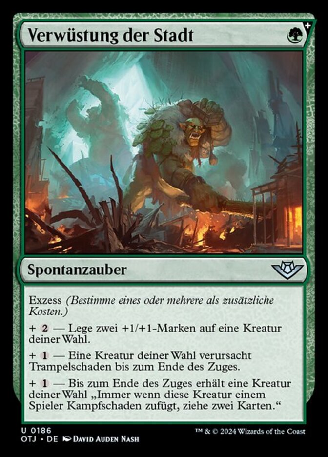| Rules | Spree (Choose one or more additional costs.) + — Put two +1/+1 counters on target creature. + — Target creature gains trample until end of turn. + — Until end of turn, target creature gains "Whenever this creature deals combat damage to a player, draw two cards." |