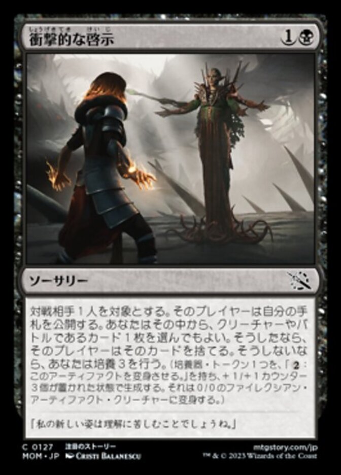 Rules Target opponent reveals their hand. You may choose a creature or battle card from it. If you do, that player discards that card. If you don't, incubate 3. (Create an Incubator token with three +1/+1 counters on it and ": Transform this artifact." It transforms into a 0/0 Phyrexian artifact creature.)