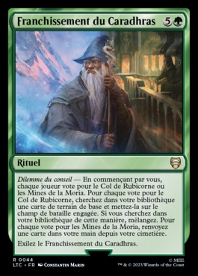 | Rules | Council's dilemma — Starting with you, each player votes for Redhorn Pass or Mines of Moria. For each Redhorn Pass vote, search your library for a basic land card and put it onto the battlefield tapped. If you search your library this way, shuffle. For each Mines of Moria vote, return a card from your graveyard to your hand. Exile Travel Through Caradhras. |