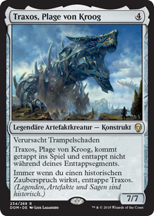 | Rules | Trample Traxos, Scourge of Kroog enters the battlefield tapped and doesn't untap during your untap step. Whenever you cast a historic spell, untap Traxos. (Artifacts, legendaries, and Sagas are historic.) |