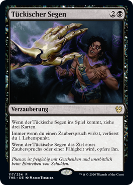 | Rules | When Treacherous Blessing enters the battlefield, draw three cards. Whenever you cast a spell, you lose 1 life. When Treacherous Blessing becomes the target of a spell or ability, sacrifice it. |