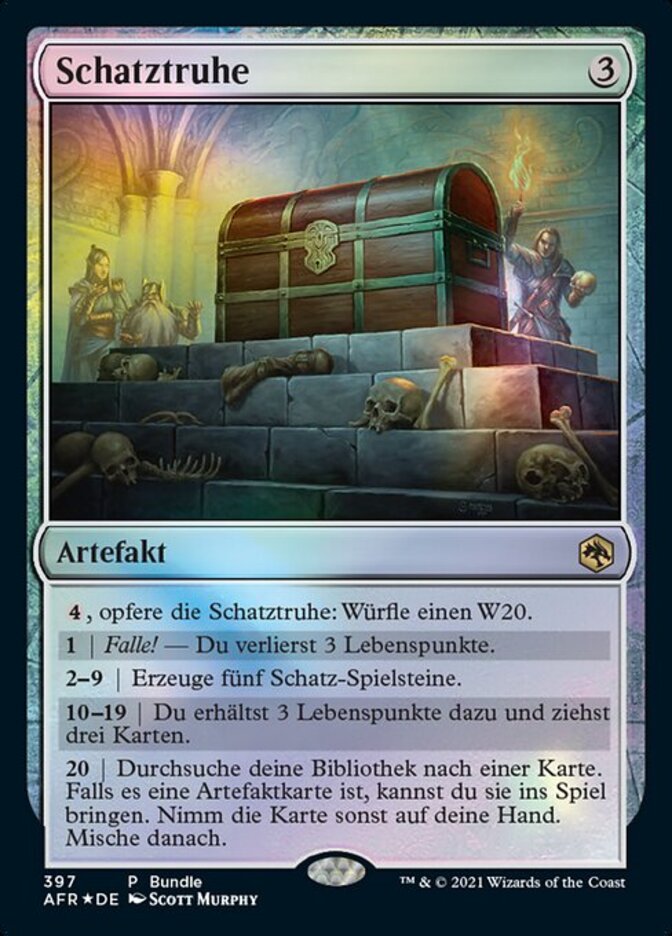 | Rules | , Sacrifice Treasure Chest: Roll a d20. 1 | Trapped! — You lose 3 life. 2—9 | Create five Treasure tokens. 10—19 | You gain 3 life and draw three cards. 20 | Search your library for a card. If it's an artifact card, you may put it onto the battlefield. Otherwise, put that card into your hand. Then shuffle. |