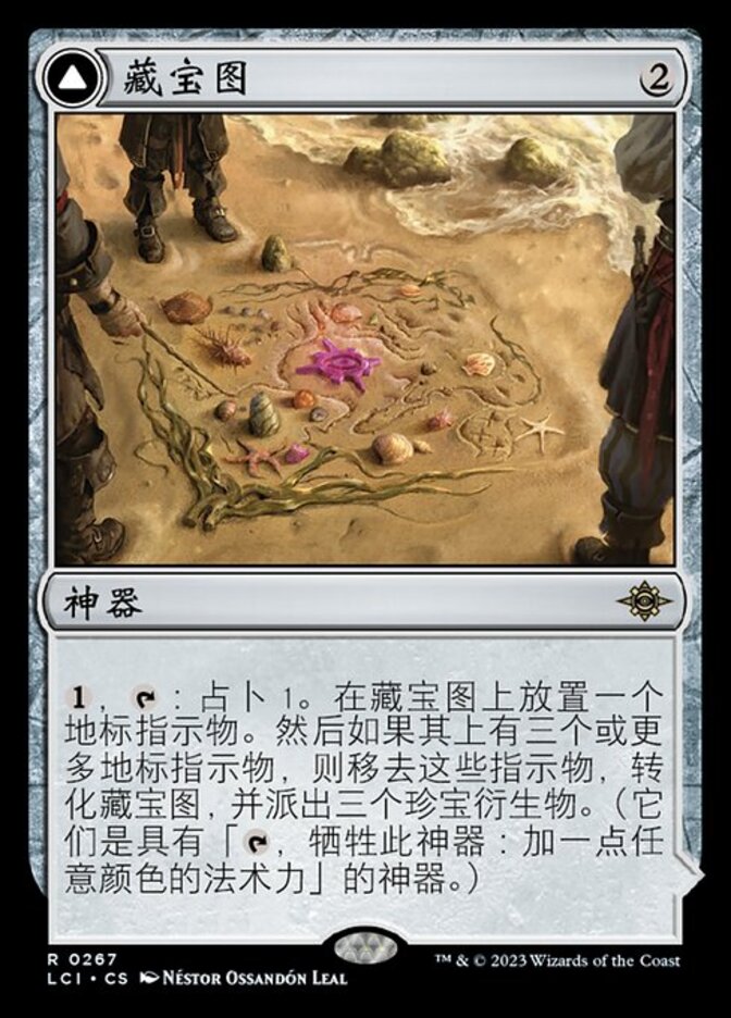 | Rules | , : Scry 1. Put a landmark counter on Treasure Map. Then if there are three or more landmark counters on it, remove those counters, transform Treasure Map, and create three Treasure tokens. (They're artifacts with ", Sacrifice this artifact: Add one mana of any color.") // (Transforms from Treasure Map.) : Add . , Sacrifice a Treasure: Draw a card. |