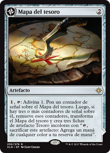 | Rules | , : Scry 1. Put a landmark counter on Treasure Map. Then if there are three or more landmark counters on it, remove those counters, transform Treasure Map, and create three Treasure tokens. (They're artifacts with ", Sacrifice this artifact: Add one mana of any color.") // (Transforms from Treasure Map.) : Add . , Sacrifice a Treasure: Draw a card. |