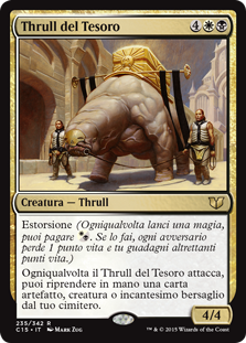 | Rules | Extort (Whenever you cast a spell, you may pay . If you do, each opponent loses 1 life and you gain that much life.) Whenever Treasury Thrull attacks, you may return target artifact, creature, or enchantment card from your graveyard to your hand. |