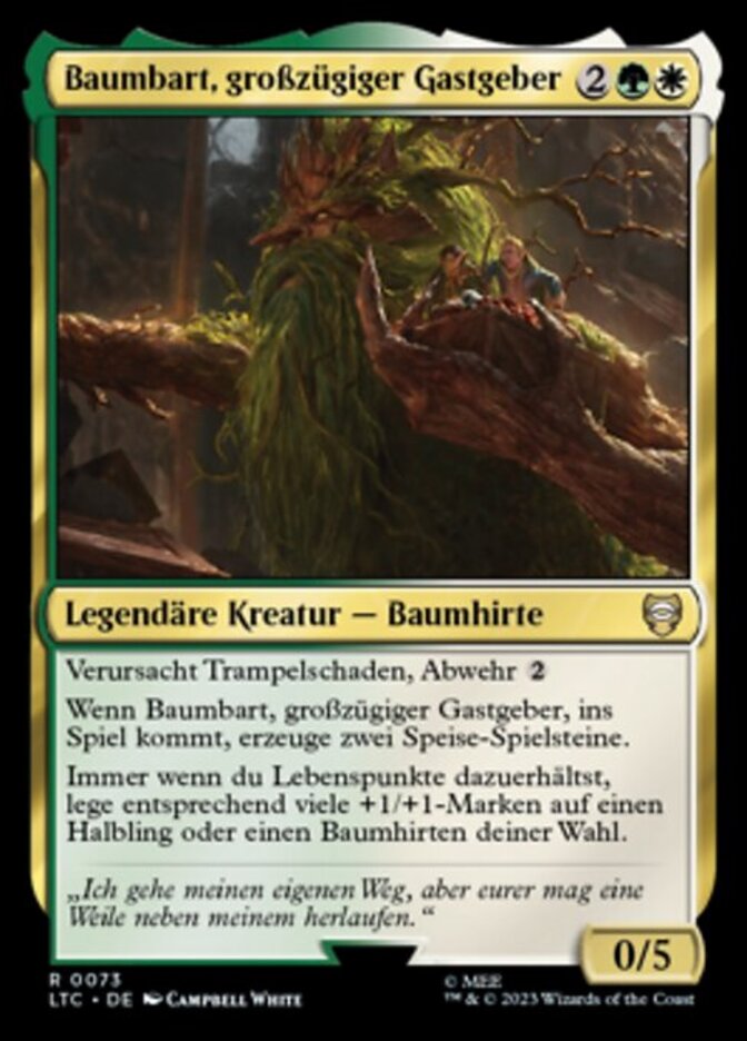 | Rules | Trample, ward When Treebeard, Gracious Host enters the battlefield, create two Food tokens. Whenever you gain life, put that many +1/+1 counters on target Halfling or Treefolk. |