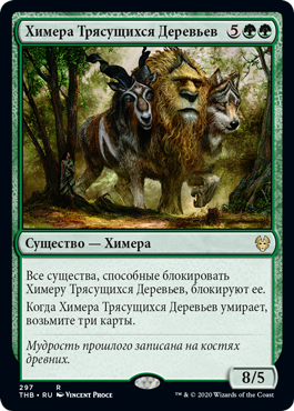| Rules | All creatures able to block Treeshaker Chimera do so. When Treeshaker Chimera dies, draw three cards. |