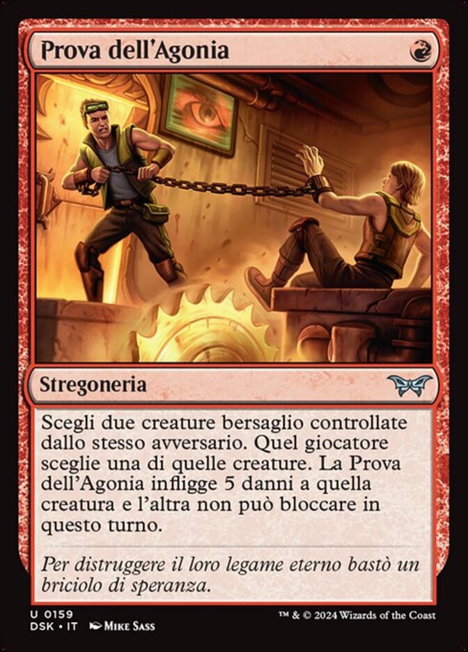 | Rules | Choose two target creatures controlled by the same opponent. That player chooses one of those creatures. Trial of Agony deals 5 damage to that creature, and the other can't block this turn. |