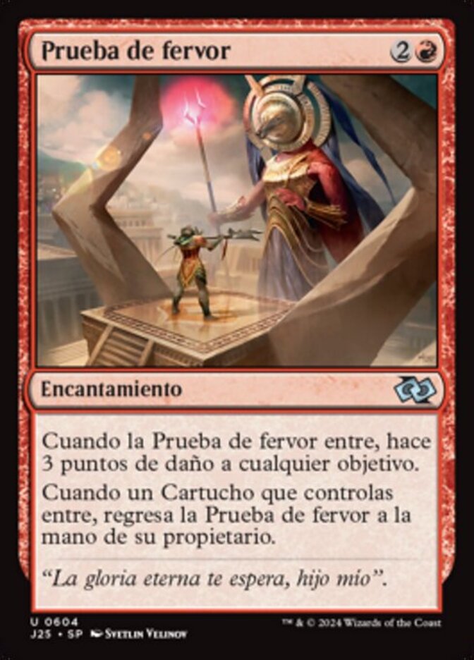 | Rules | When Trial of Zeal enters the battlefield, it deals 3 damage to any target. When a Cartouche enters the battlefield under your control, return Trial of Zeal to its owner's hand. |