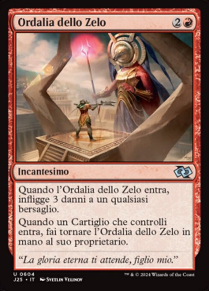 | Rules | When Trial of Zeal enters the battlefield, it deals 3 damage to any target. When a Cartouche enters the battlefield under your control, return Trial of Zeal to its owner's hand. |