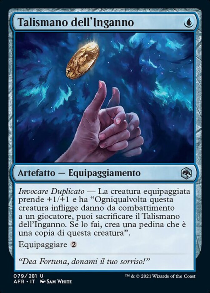 | Rules | Invoke Duplicity — Equipped creature gets +1/+1 and has "Whenever this creature deals combat damage to a player, you may sacrifice Trickster's Talisman. If you do, create a token that's a copy of this creature." Equip |