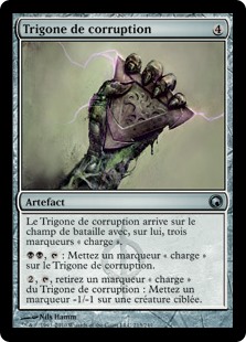 | Rules | Trigon of Corruption enters the battlefield with three charge counters on it. , : Put a charge counter on Trigon of Corruption. , , Remove a charge counter from Trigon of Corruption: Put a -1/-1 counter on target creature. |