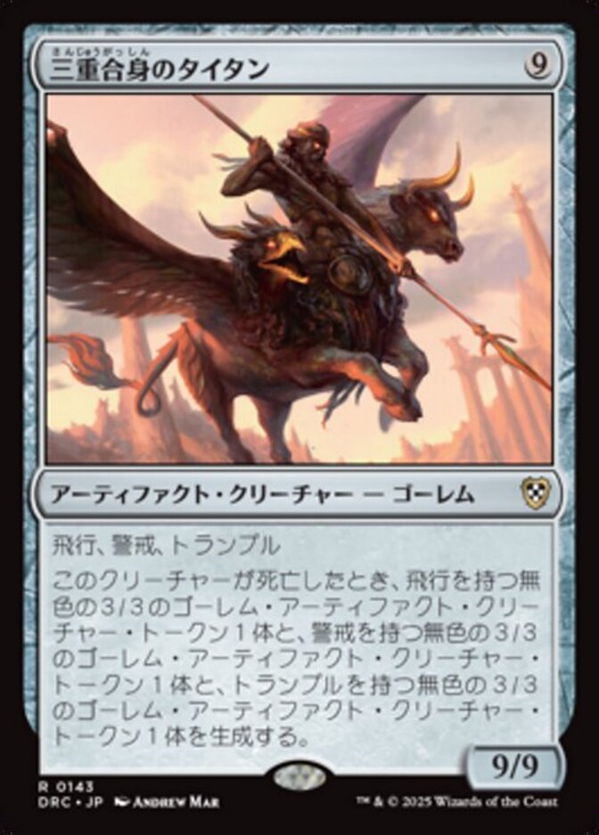 | Rules | Flying, vigilance, trample When Triplicate Titan dies, create a 3/3 colorless Golem artifact creature token with flying, a 3/3 colorless Golem artifact creature token with vigilance, and a 3/3 colorless Golem artifact creature token with trample. |