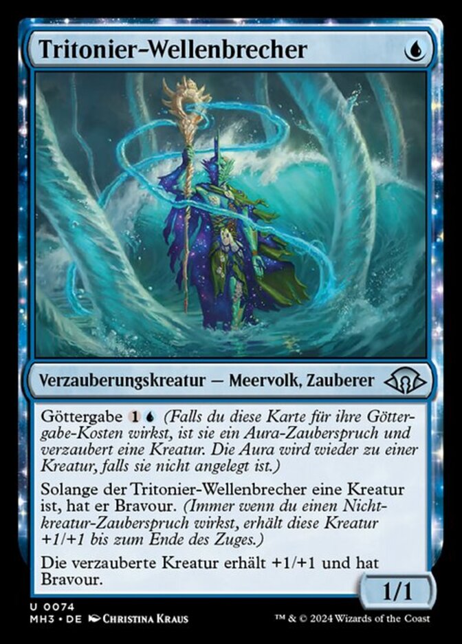 | Rules | Bestow (If you cast this card for its bestow cost, it's an Aura spell with enchant creature. It becomes a creature again if it's not attached.) As long as Triton Wavebreaker is a creature, it has prowess. (Whenever you cast a noncreature spell, this creature gets +1/+1 until end of turn.) Enchanted creature gets +1/+1 and has prowess. |