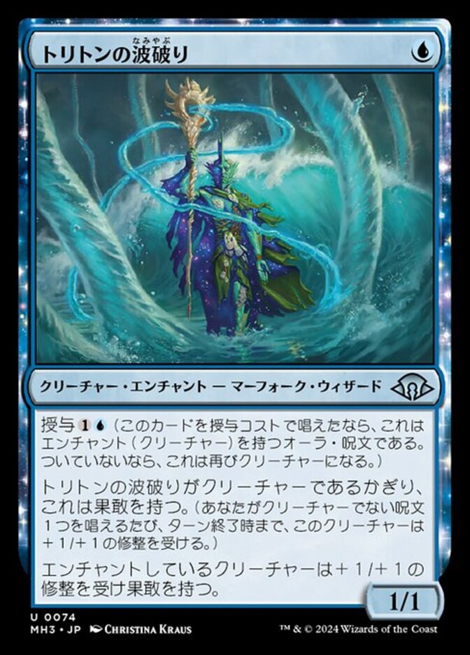| Rules | Bestow (If you cast this card for its bestow cost, it's an Aura spell with enchant creature. It becomes a creature again if it's not attached.) As long as Triton Wavebreaker is a creature, it has prowess. (Whenever you cast a noncreature spell, this creature gets +1/+1 until end of turn.) Enchanted creature gets +1/+1 and has prowess. |