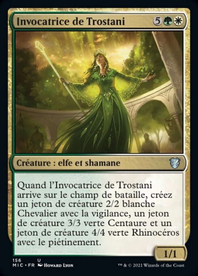 | Rules | When Trostani's Summoner enters the battlefield, create a 2/2 white Knight creature token with vigilance, a 3/3 green Centaur creature token, and a 4/4 green Rhino creature token with trample. |