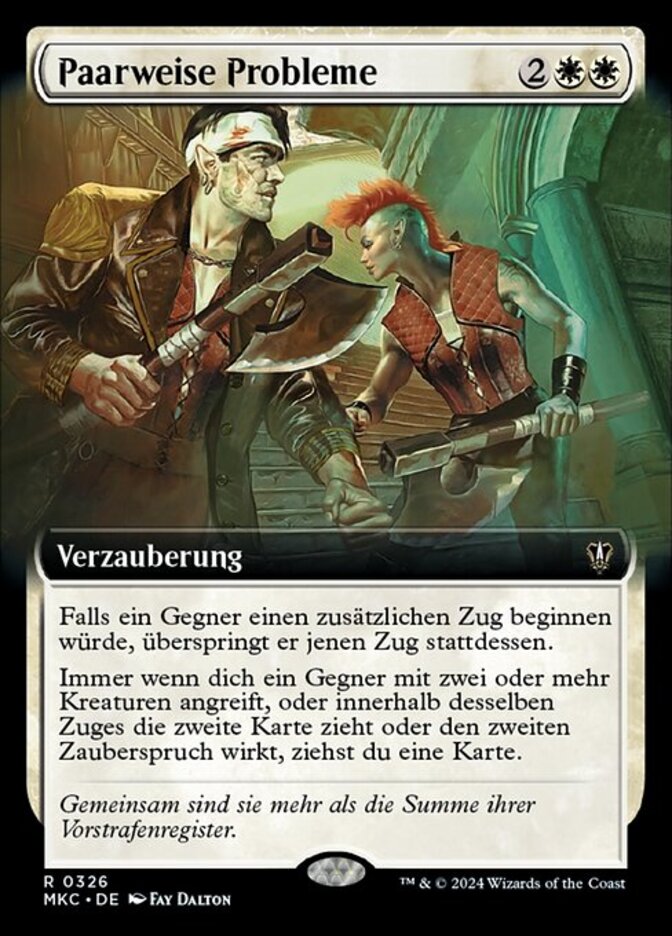 | Rules | If an opponent would begin an extra turn, that player skips that turn instead. Whenever an opponent attacks you with two or more creatures, draws their second card each turn, or casts their second spell each turn, you draw a card. |