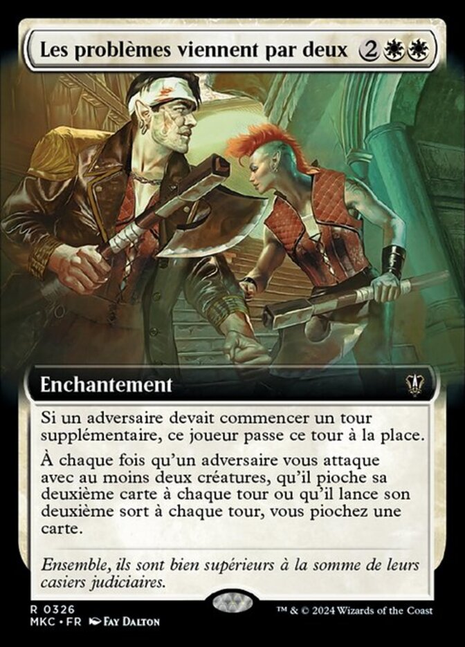 | Rules | If an opponent would begin an extra turn, that player skips that turn instead. Whenever an opponent attacks you with two or more creatures, draws their second card each turn, or casts their second spell each turn, you draw a card. |