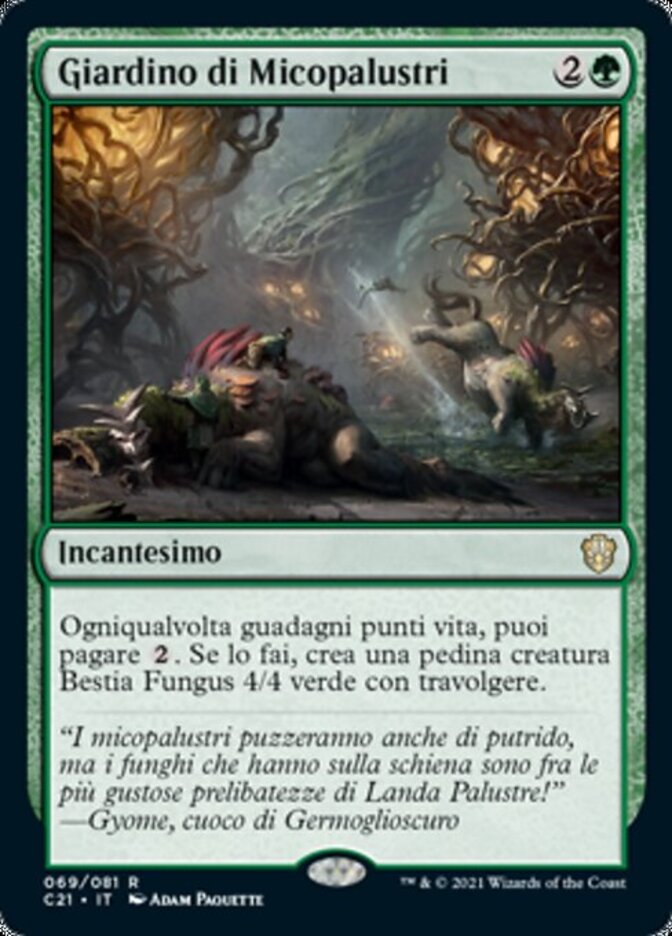 | Rules | Whenever you gain life, you may pay . If you do, create a 4/4 green Fungus Beast creature token with trample. |