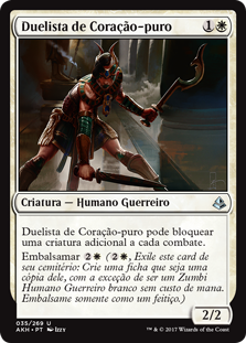 | Rules | Trueheart Duelist can block an additional creature each combat. Embalm (, Exile this card from your graveyard: Create a token that's a copy of it, except it's a white Zombie Human Warrior with no mana cost. Embalm only as a sorcery.) |