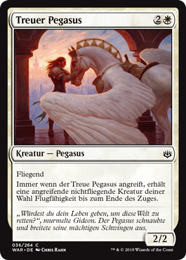 | Rules | Flying (This creature can't be blocked except by creatures with flying or reach.) Whenever Trusted Pegasus attacks, target attacking creature without flying gains flying until end of turn. |
