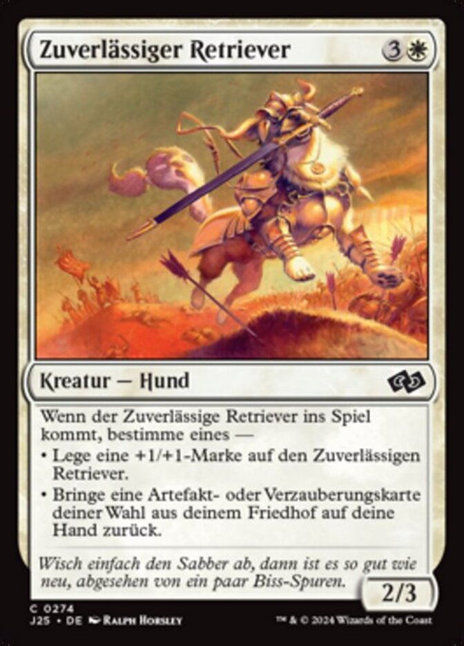 | Rules | When Trusty Retriever enters the battlefield, choose one — • Put a +1/+1 counter on Trusty Retriever. • Return target artifact or enchantment card from your graveyard to your hand. |