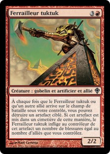 | Rules | Whenever Tuktuk Scrapper or another Ally enters the battlefield under your control, you may destroy target artifact. If that artifact is put into a graveyard this way, Tuktuk Scrapper deals damage to that artifact's controller equal to the number of Allies you control. |