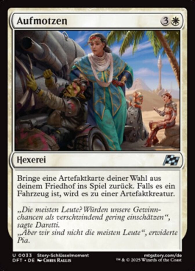 | Rules | Return target artifact card from your graveyard to the battlefield. If it's a Vehicle, it becomes an artifact creature. |