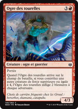 | Rules | Reach (This creature can block creatures with flying.) When Turret Ogre enters the battlefield, if you control another creature with power 4 or greater, Turret Ogre deals 2 damage to each opponent. |