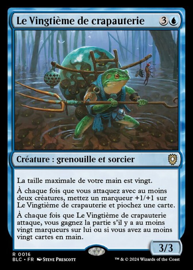 | Rules | Your maximum hand size is twenty. Whenever you attack with two or more creatures, put a +1/+1 counter on Twenty-Toed Toad and draw a card. Whenever Twenty-Toed Toad attacks, you win the game if there are twenty or more counters on it or you have twenty or more cards in hand. |