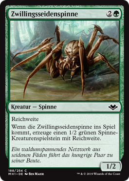 When Twin-Silk Spider enters the battlefield, create a 1/2 green Spider creature token with reach.