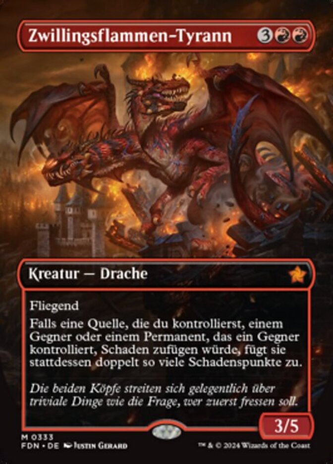 | Rules | Flying If a source you control would deal damage to an opponent or a permanent an opponent controls, it deals double that damage instead. |