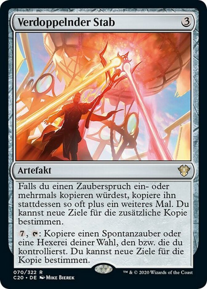 | Rules | If you would copy a spell one or more times, instead copy it that many times plus an additional time. You may choose new targets for the additional copy. , : Copy target instant or sorcery spell you control. You may choose new targets for the copy. |