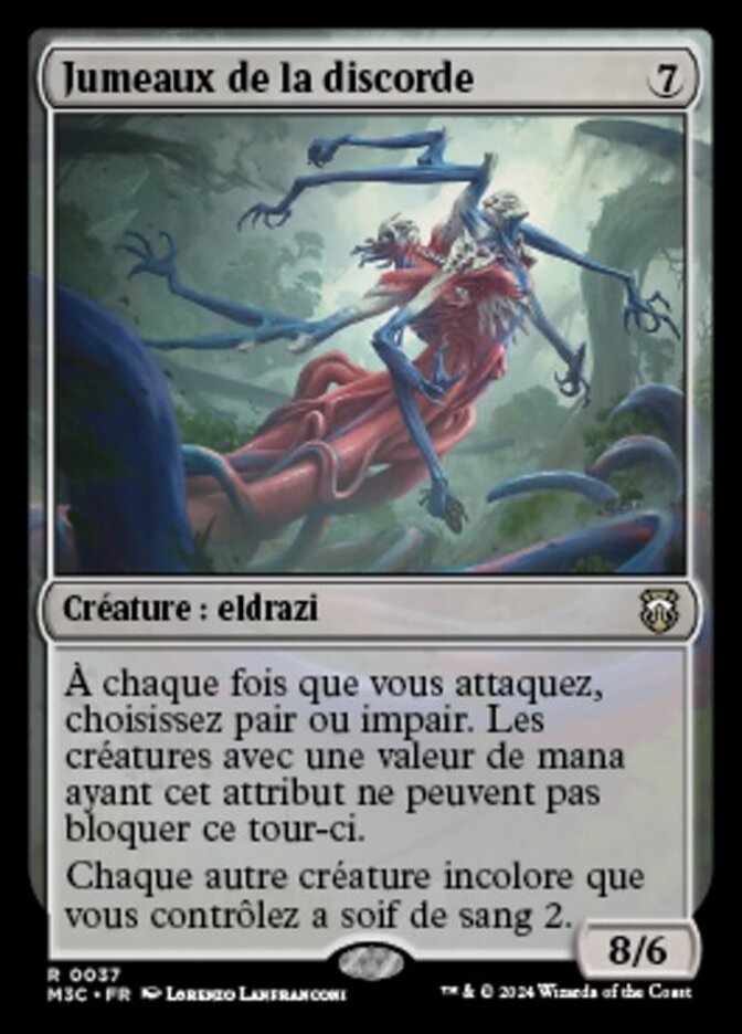 | Rules | Whenever you attack, choose odd or even. Creatures with mana value of that quality can't block this turn. Each other colorless creature you control has bloodthirst 2. |