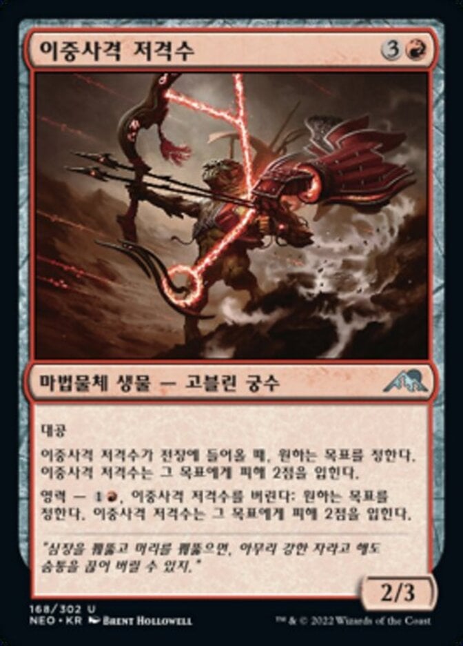 | Rules | Reach When Twinshot Sniper enters the battlefield, it deals 2 damage to any target. Channel — , Discard Twinshot Sniper: It deals 2 damage to any target. |
